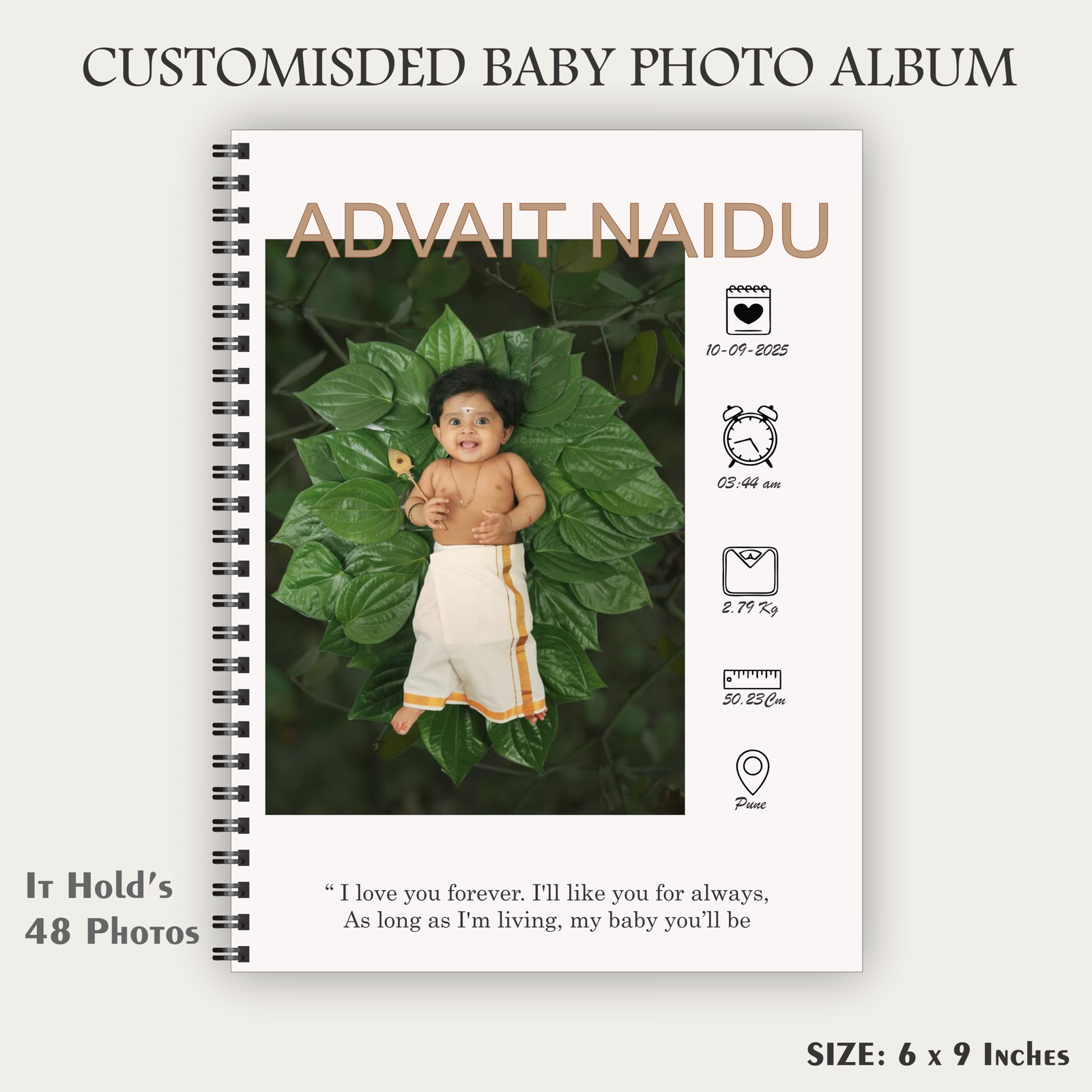 Fully Personalized Cover: Features your baby’s name, birth date, time, weight, height, and place of birth alongside their first portrait.